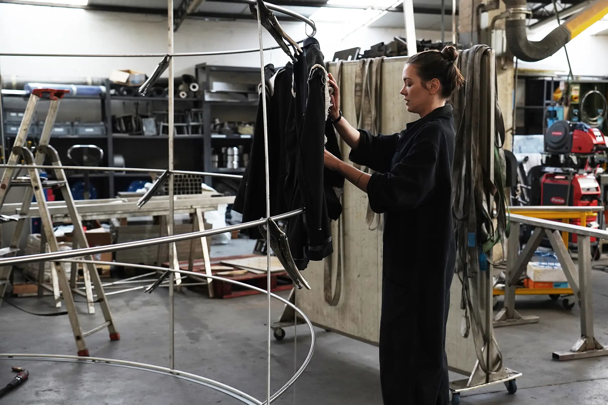 In this work, however, textiles are not mere scenic elements. They have been dismantled, opened, manipulated to reveal their internal structures: seams, padding, linings, reinforcing canvases—everything that usually remains hidden from view. Each intervention on the materials brings to light the invisible labor beneath every formal construction. It is an act of unveiling that echoes the lives and work of women historically confined to the margins of narrative. Again and again, in the history of women’s contribution to textile production, their role has been essential yet often concealed, stitched into shadow, taken for granted. It has dispersed into the invisible weavings of places and people that have shaped reality. Yet places are defined by people, and people carry memory.